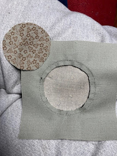 I'm gathering them around 1 3/4" paper circles from www.paperpieces.com. I starch them to hold the finished edge.
