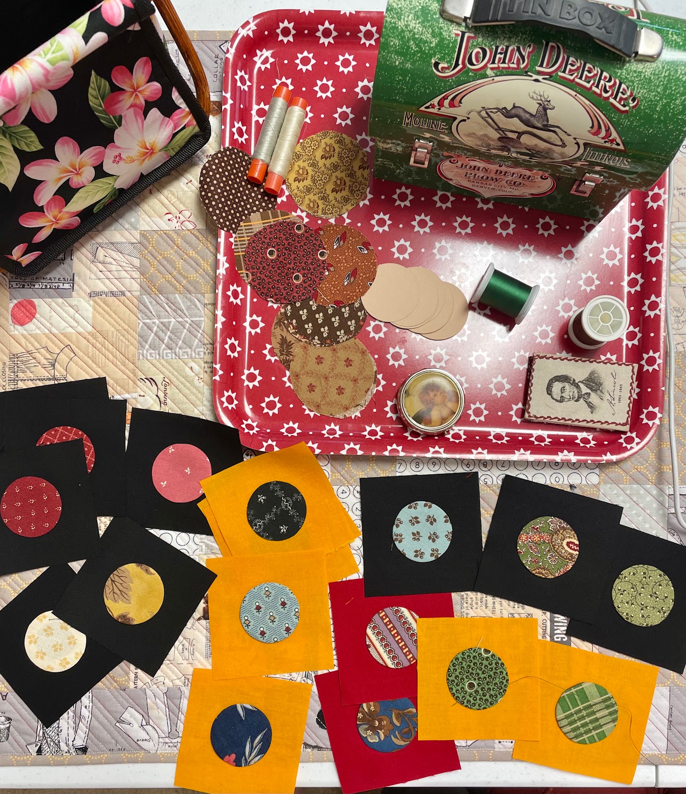 What a great little project this is. Betsy designs wonderful repro fabrics, and your red/cheddar/black backgrounds really make them shine. Your circles turn out very precise and beautiful!